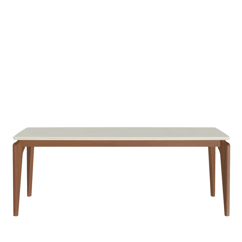 Pés e travessas são produzidos em madeira maciça usinada e acabada em verniz poliuretano de alta resistência. Possui tampo produzido em madeira reconstituída MDF com borda chanfrada e pintada em laca acetinada, possui tampo de vidro pintado e colado em sua superfície, simplificando a limpeza e ampliando a durabilidade.